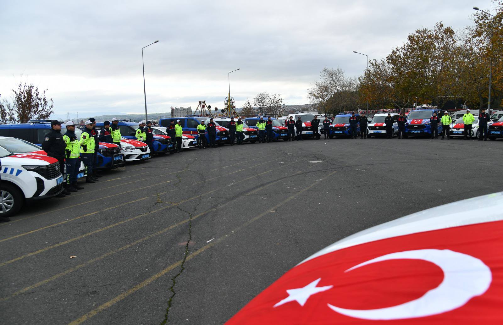 İçişleri Bakanlığınca gönderilen araçlar, sahil dolgu alanında düzenlenen törenle teşkilatlara teslim edildi.