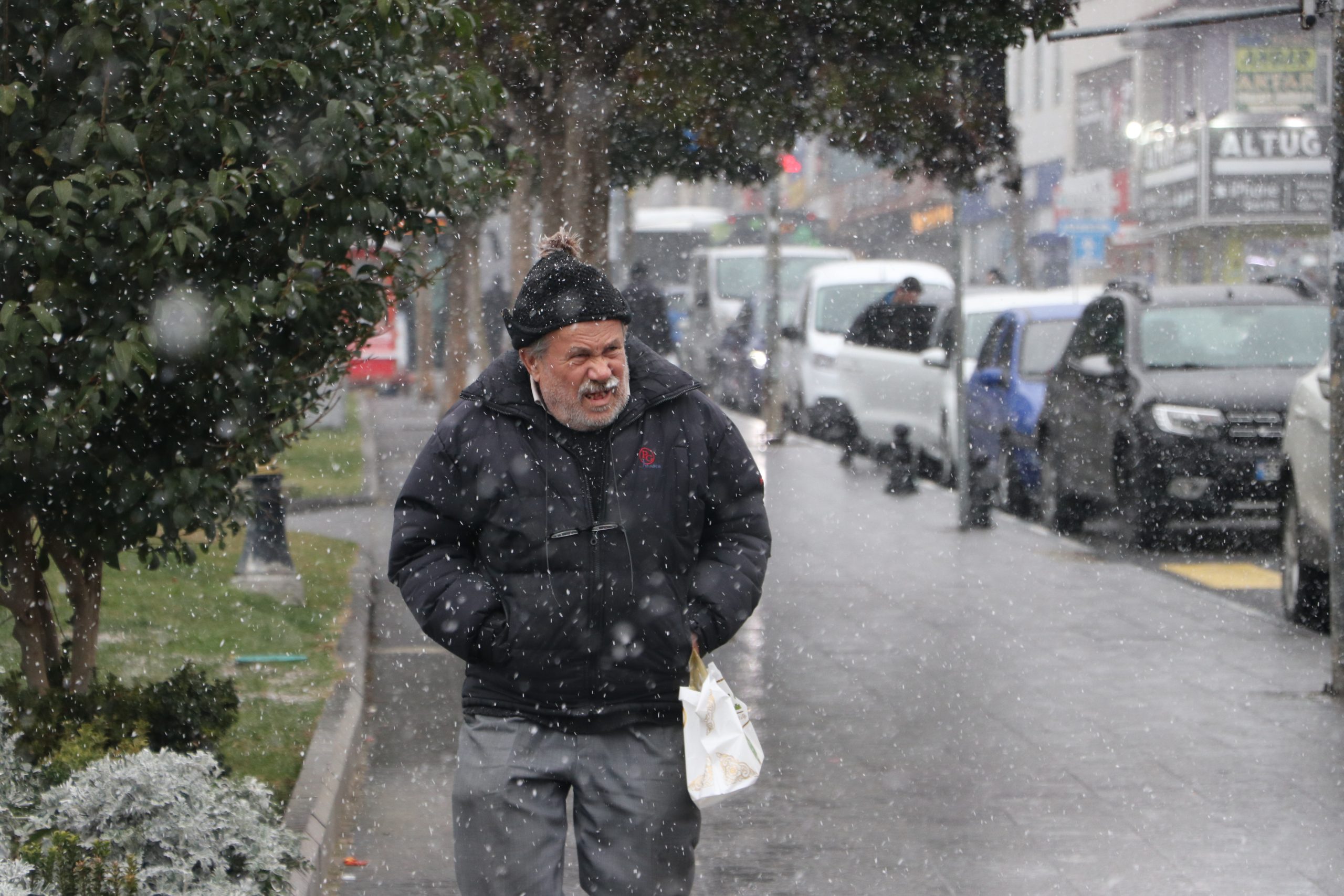 Hava sıcaklığının 3 derece ölçüldüğü kent merkezinde kar yağışı nedeniyle yer yer çatı ve araçların üzeri beyaz örtüyle kaplandı.
