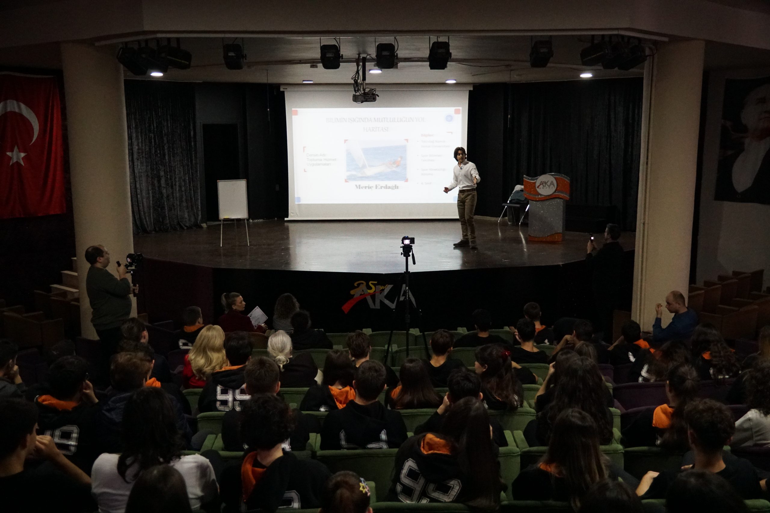 Tekirdağ Namık Kemal Üniversitesi Spor Yöneticiliği Bölümü 4. sınıf öğrencisi Meriç Erdağlı, Tekirdağ Aka Koleji’nde öğrenciler ve öğretmenlere yönelik “Bilimin Işığında Mutluluğun Yol Haritası” başlıklı kapsamlı bir konferans gerçekleştirdi.